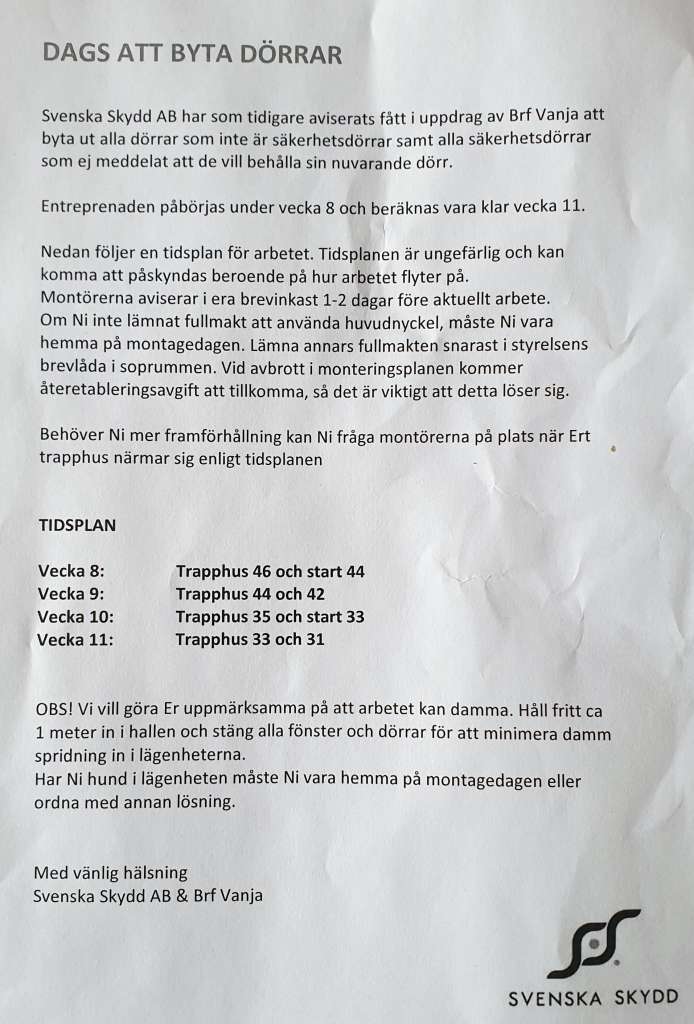 Infoblad från Svenska Skydd AB angående säkerhetsdörrar 2019-02-19 By BRF Vanja|2019-02-19T12:53:19+01:00februari 19th, 2019|Nyheter|0 Comments Share This Story, Choose Your Platform! FacebookTwitterLinkedInRedditWhatsappGoogle+TumblrPinterestVkEmail About the Author: BRF Vanja Related Posts Gallery Viktigt! Gallery Viktigt! Ullared och andra medlemserbjudanden från HSB Gallery Ullared och andra medlemserbjudanden från HSB Inbrott i garage Gallery Inbrott i garage Onödiga utgifter Gallery Onödiga utgifter Leave A Comment Avbryt svarComment Save my name, email, and website in this browser for the next time I comment.